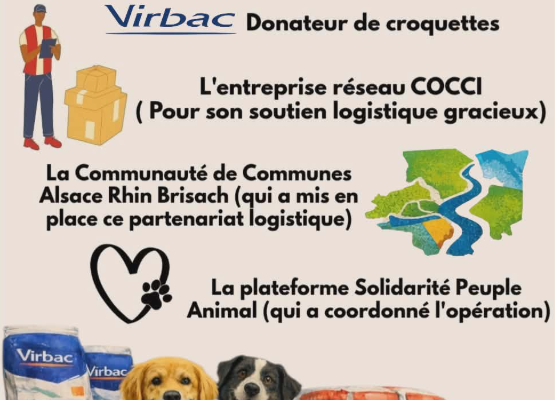 Notre refuge a bénéficié d’un don de croquettes conséquent grâce à: -VIRBAC, donateur de croquettes -L’entreprise réseau COCCI (pour son soutien logistique gracieux) -La Communauté de Communes Alsace Rhin Brisach (qui a mis en place ce partenariat logistique) -La plateforme Solidarité Peuple Animal (qui a coordonné l’opération) Un grand merci à tous ces partenaires !