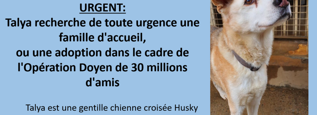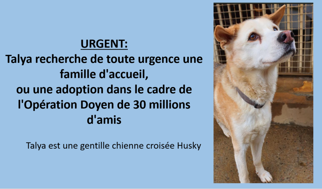 Nous recherchons de toute urgence pour Thalya une famille d’accueil ou une famille adoptante. Thalya est âgée, elle souffre de sa vie au refuge, elle a besoin énormément de présence, elle pleure dès qu’elle nous voit partir, elle tremble aussi de stress ! Gentille comme tout, facile à vivre, Thalya ne demande qu’une chose : trouver une famille qui lui apportera un peu de bonheur et de chaleur pour finir ses jours tranquillement. Elle a besoin de calme et d’attention, nous éviterons donc les familles avec de jeunes enfants et une famille non disponible. Elle peut prétendre au dispositif Sénior de 30 Millions d’Amis qui permet de régler les factures des frais vétérinaires jusqu’à hauteur de 1 000 euros dans le cadre de son adoption. Dans le cadre famille d’accueil, la SPA prendra en charge une partie des frais vétérinaires jusqu’à la fin de son accompagnement. Nous ne pouvons imaginer que Thalya finira sa vie au refuge, ce serait trop cruel, injuste et inhumain. Aidez là, elle a besoin de vous, c’est un véritable appel au secours pour cette petite ! Merci infiniment