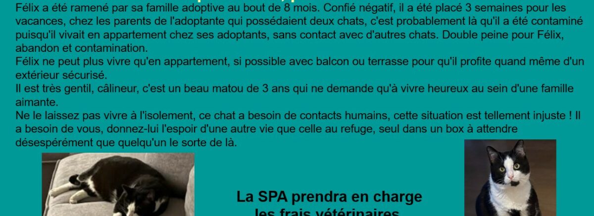 Nous recherchons en urgence une famille d’accueil pour Félix, positif FIV. Félix a été ramené par sa famille adoptive au bout de 8 mois. Confié négatif, il a été placé 3 semaines pour les vacances, chez les parents de l’adoptante qui possédaient deux chats, c’est probablement là qu’il a été contaminé puisqu’il vivait en appartement chez ses adoptants, sans contact …