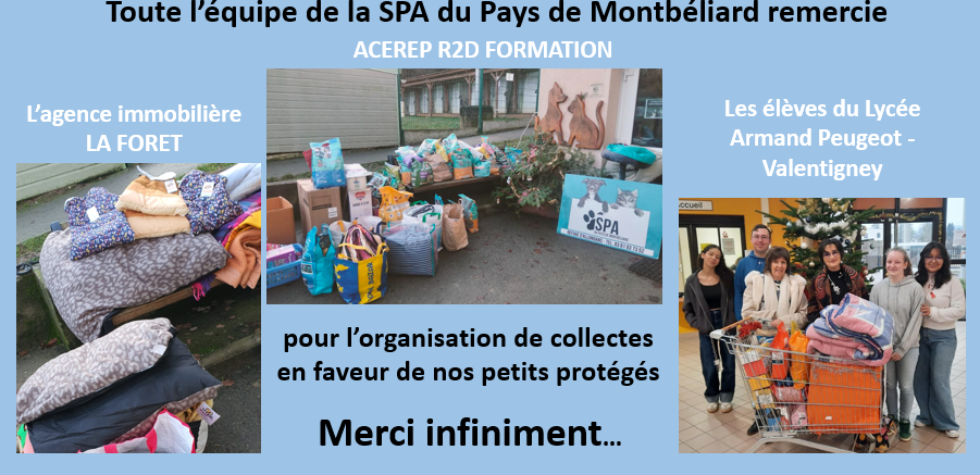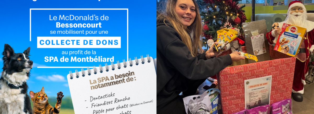 Un petit geste pour un grand Noël . Parce que la magie des fêtes se partage aussi avec nos amis à quatre pattes Votre McDonald’s Bessoncourt organise une collecte de dons au profit de la SPA du Pays de Montbéliard – refuge d’Allondans Jusqu’à la fin du mois de décembre, vous pouvez participer en déposant : pâtée, friandises ou accessoires …